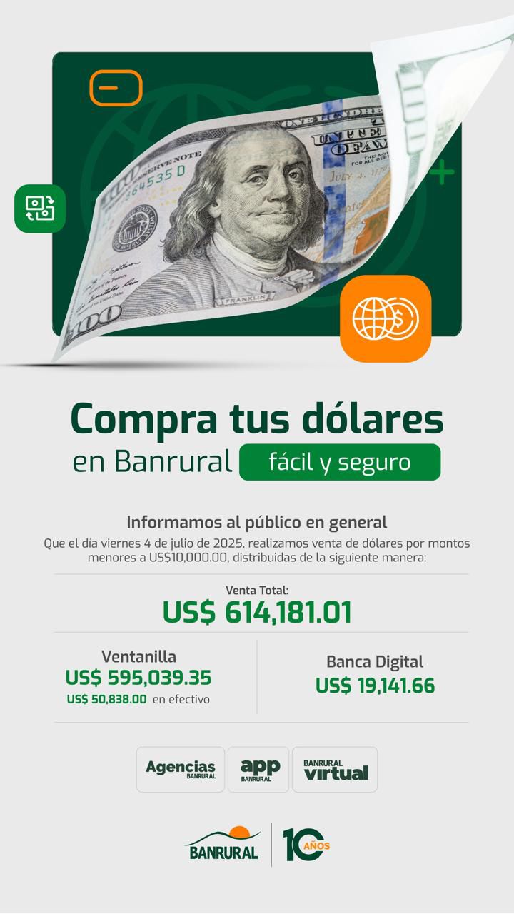 07 Jul Ventas realizadas – 4 julio Posted at 09:43h in Venta de Divisas by Banrural Share Venta de divisas y disponibilidad.